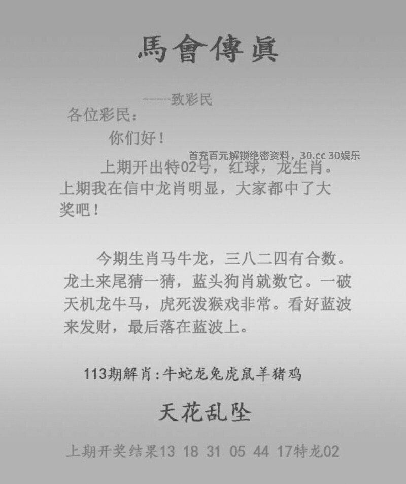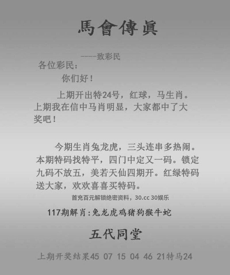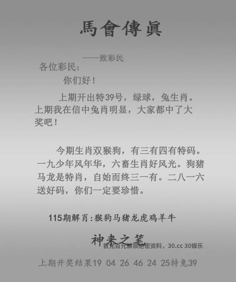117期:【正版马会传真】{开:虎04} 今期生肖兔龙虎,三头连串多热闹 本期特码找特平,四门中定又一码 锁定九码不放五,美若天仙四期开 红绿特码送大家,欢欢喜喜买特码 五代同堂 综合取肖:兔龙虎鸡猪狗猴牛蛇 ![]() |